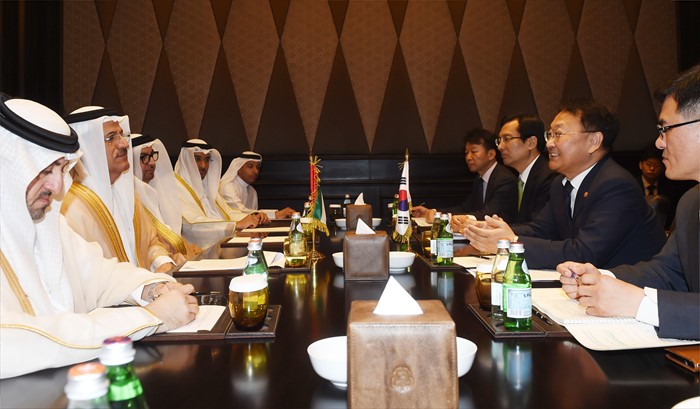 (서울=포커스뉴스) 유일호 부총리 겸 기획재정부 장관이 30일(현지시간) UAE 아부다비 St.REGIS호텔에서 열린 '제5차 한-UAE 경제공동위'에 참석, 회의시작에 앞서 수석대표인 알 만수리 경제부 장관과 사전면담을 하고 있다. <사진제공=기획재정부>