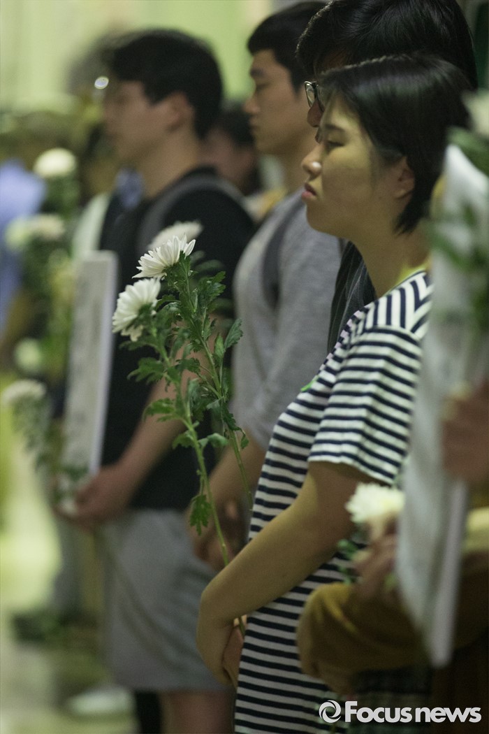 (서울=포커스뉴스) 30일 오후 서울 광진구 구의역 내 스크린도어 사망사고 발생 장소인 9-4 승강장에서 시민들이 국화를 들고 고인을 추모하고 있다.