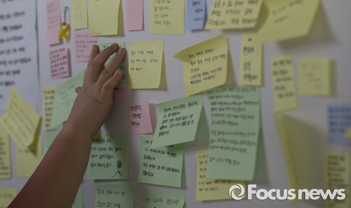 (서울=포커스뉴스) 30일 오후 서울 광진구 구의역 내에 마련된 스크린도어 사망사고 추모 장소에서 한 시민이 추모 쪽지를 붙이고 있다.