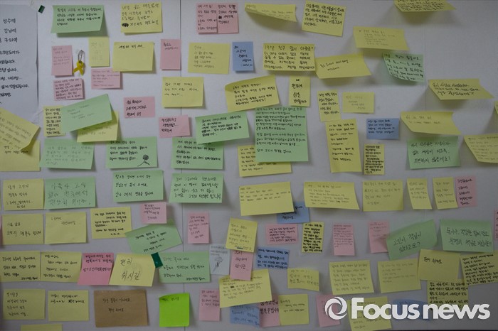 (서울=포커스뉴스) 30일 오후 서울 광진구 구의역 내에 마련된 스크린도어 사망사고 추모 장소에 고인을 추모하는 쪽지가 붙여 있다.