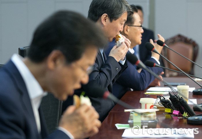 (서울=포커스뉴스) 31일 오전 서울 여의도 국회 의원회관에서 열린 국민의당 8차 정책역량강화 워크숍에 참석한 안철수(가운데) 상임공동대표, 천정배(왼쪽) 공동대표가 샌드위치를 먹고 있다.