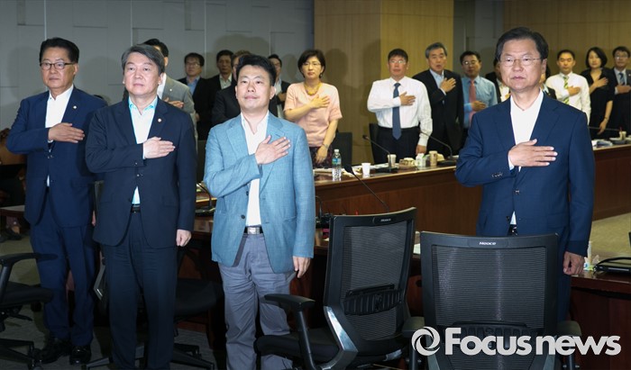 (서울=포커스뉴스) 31일 오전 서울 여의도 국회 의원회관에서 열린 국민의당 8차 정책역량강화 워크숍에 참석한 천정배(오른쪽부터) 공동대표, 강연자로 나선 임정욱 스타트업얼라이언스 센터장, 안철수 상임공동대표, 박지원 원내대표 등 의원들이 국기에 대한 경례를 하고 있다.