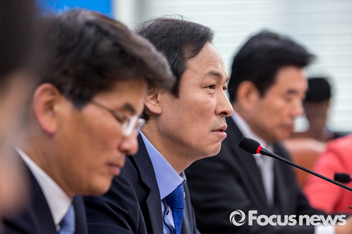 (서울=포커스뉴스) 우상호 더불어민주당 원내대표가 31일 오전 서울 여의도 국회에서 열린 원내대책회의에 참석해 모두발언 하고 있다.