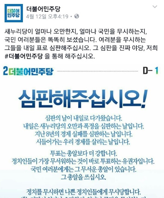 더불어민주당은 총선 하루전인 4월12일 총 18개의 게시물을 페이스북에 게재했다. 다른 당에 비해 월등히 많은 게시물 수였다.