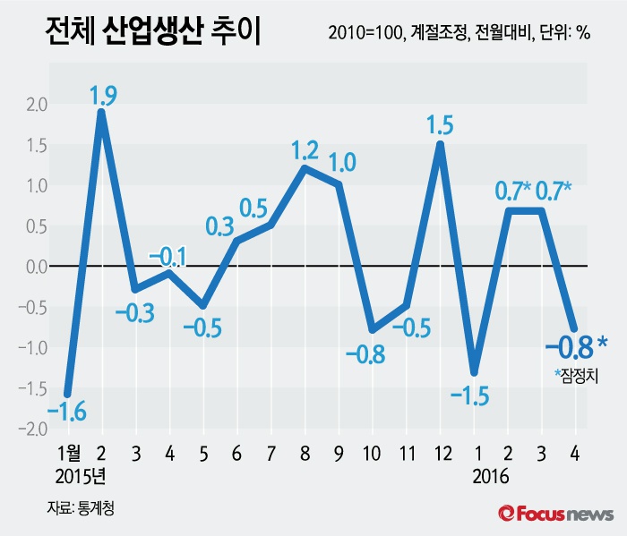 (서울=포커스뉴스) 31일 통계청이 발표한 ‘2016년 4월 산업활동동향’에 따르면 지난 4월 산업생산이 전월대비 -0.8%(잠정치)로 3개월 만에 감소세로 돌아섰다.