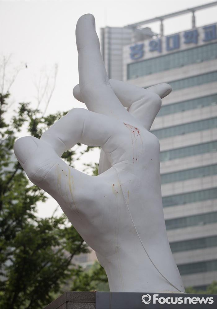 (서울=포커스뉴스) 31일 오전 서울 마포구 홍익대 정문 앞에 극우성향 사이트 '일베' 상징물 조각상이 설치되어 있다. 조각상은 일간베스트저장소를 상징하는 자음 'ㅇ'과 'ㅂ' 모양을 하며 회원을 인증하는 손 모양이다. 이 조각상은 조소과 4학년 홍기하씨가 '환경조각연구' 수업 과제로 제작되어 '환경조각연구 야외조각전에 출품한 것으로 '어디에나 있고, 아무데도 없다'는 제목을 붙였다.