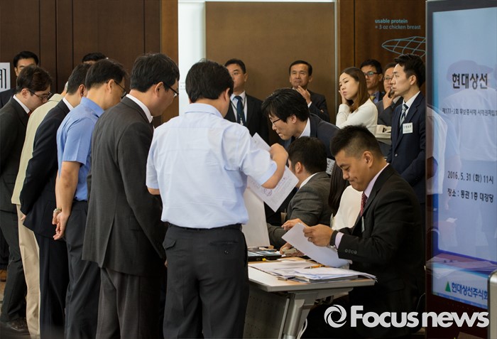 (서울=포커스뉴스) 31일 오전 서울 종로구 현대그룹 본사에서 열린 현대상선 사채권자 집회에 사채권자 및 관계자들이 입장하고 있다. 사채권자 집회는 일정 금액 이상 사채권자들의 동의를 얻어 해당 사채의 조건을 일괄 변경하는 상법 절차다.