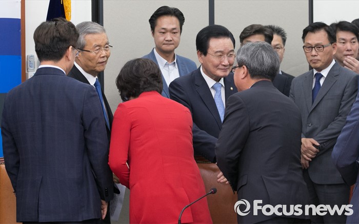 (서울=포커스뉴스) 김종인(왼쪽 두번째) 더불어민주당 비대위 대표와 변재일(왼쪽 네번째) 정책위의장이 31일 오전 서울 여의도 국회에서 지방재정 개편 관련 면담에 앞서 지방자치단체장과 인사하고 있다.