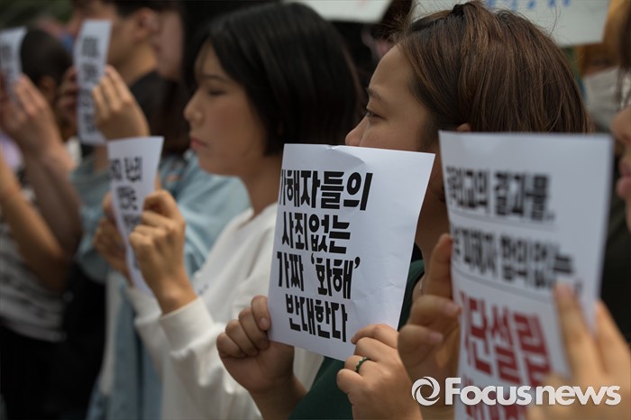 (서울=포커스뉴스) 한일 일본군위안부 합의 무효를 위한 대학생 대책위원회 학생들이 31일 오전 서울 종로구 대한민국역사박물관 앞에서 일본군위안부 피해자 의견 배제한 재단설립 강행 규탄 기자회견을 열고 있다.