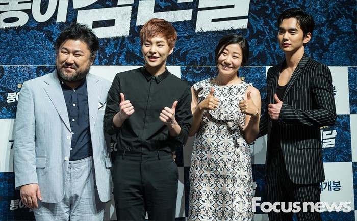 (서울=포커스뉴스) 31일 오전 서울 강남구 압구정CGV에서 열린 영화 '봉이 김선달' 제작보고회에 참석한 출연진이 포토타임을 갖고 있다. 왼쪽부터 배우 고창석, 시우민, 라미란, 유승호.