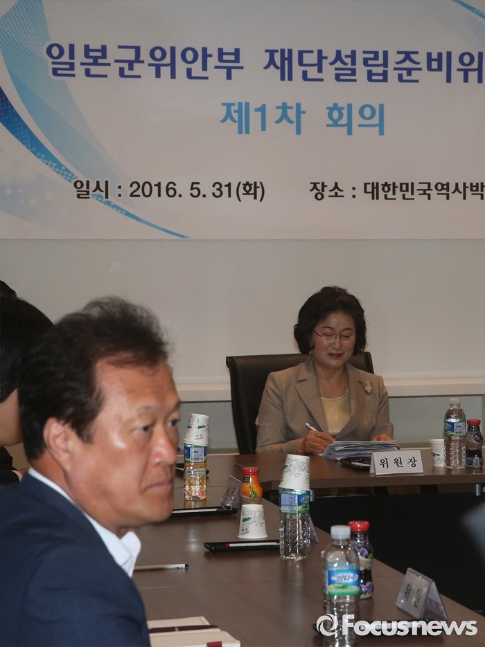 (서울=포커스뉴스) 한일간 일본군 위안부 합의에 따른 위안부 재단 설립 준비위원회 제1차회의가 열린 31일 오전 서울 세종로 대한민국역사박물관 회의실에서 위원장인 김태현 성신여대 명예교수(오른쪽)와 위원들이 회의를 시작하고 있다.