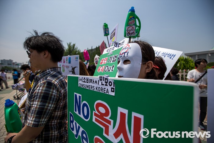 (서울=포커스뉴스) 31일 오후 서울 여의도 국회 앞에서 경제정의실천시민연합 관계자들이 옥시 제품 불매 및 옥시 예방법 제정을 촉구하는 기자회견을 하고 있다.