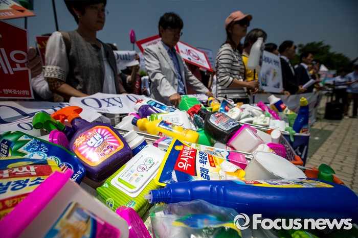 (서울=포커스뉴스) 31일 오후 서울 여의도 국회 앞에서 경제정의실천시민연합 관계자들이 옥시 제품 불매 및 옥시 예방법 제정을 촉구하는 기자회견을 하고 있다.