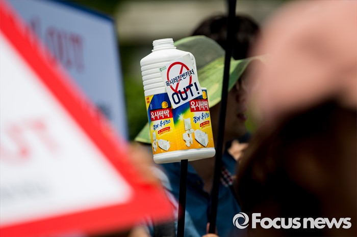 (서울=포커스뉴스) 31일 오후 서울 여의도 국회 앞에서 경제정의실천시민연합 관계자들이 옥시 제품 불매 및 옥시 예방법 제정을 촉구하는 기자회견을 하고 있다.