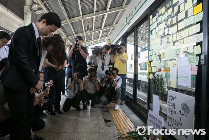 (서울=포커스뉴스) 31일 오후 서울 광진구 지하철 구의역에서 스크린도어 정비 작업 중 사고로 숨진 김모(19) 씨 사건 항의 기자회견을 마친 김 씨의 친구와 한국청년연대 등 청년단체들이 사건장소를 찾아 고인을 추모하고 있다.