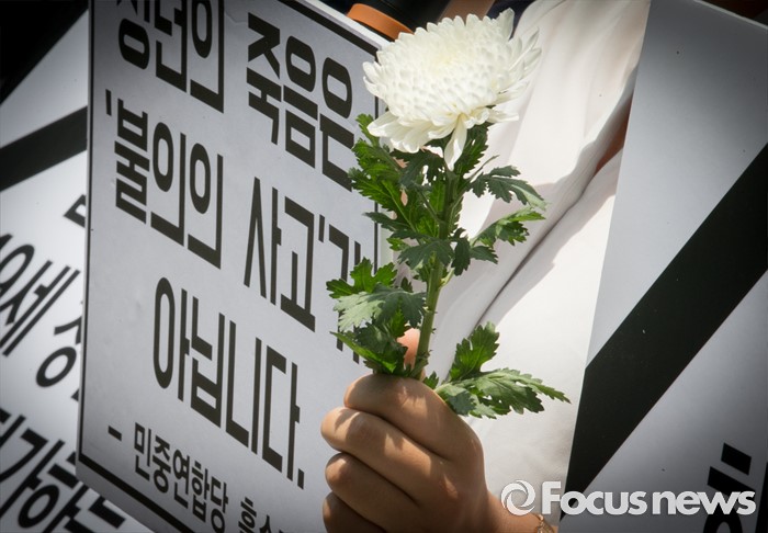 (서울=포커스뉴스) 31일 오후 서울 광진구 지하철 구의역 앞에서 한국청년연대 등 청년단체들이 스크린도어 정비 작업 중 사고로 숨진 김모(19) 씨 사건 항의 기자회견을 하고 있다.