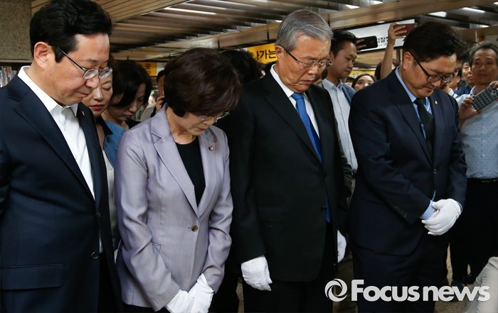 (서울=포커스뉴스) 김종인 더불어민주당 비대위 대표와 을지로위원회 소속 의원들이 31일 오후 서울 광진구 지하철 구의역 역사 내에 마련된 스크린도어 정비 작업 중 사고로 숨진 김모(19) 씨의 추모공간을 방문해 묵념을 하고 있다.