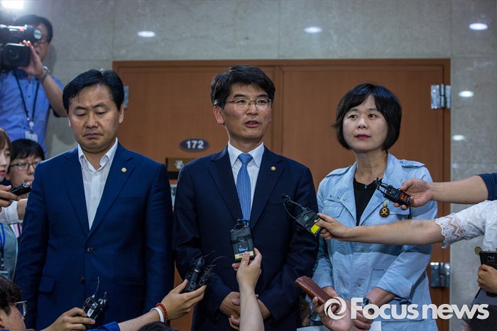 (서울=포커스뉴스) 야3당 원내수석부대표들이 31일 오후 서울 여의도 국회에서 가습기 살균제 사건, 세월호특별법 제정, 어버이연합 게이트 등 현안 공조 관련 브리핑을 마친 뒤 기자회견장을 나서고 있다. 왼쪽부터 김관영 국민의당 원내수석부대표, 박완주 더불어민주당 원내수석 부대표, 이정미 정의당 원내수석부대표.