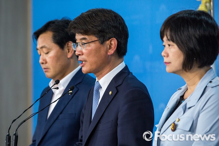 (서울=포커스뉴스) 야3당 원내수석부대표들이 31일 오후 서울 여의도 국회에서 가습기 살균제 사건, 세월호특별법 제정, 어버이연합 게이트 등 현안 공조 관련 기자회견을 하고 있다. 왼쪽부터 김관영 국민의당 원내수석부대표, 박완주 더불어민주당 원내수석부대표, 이정미 정의당 원내수석부대표.