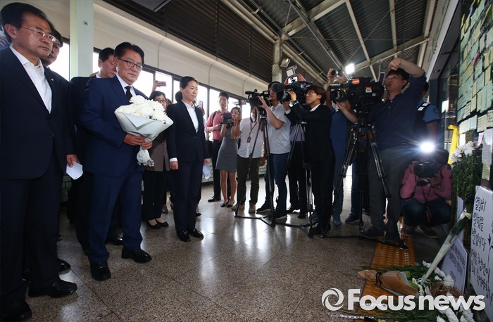 (서울=포커스뉴스) 박지원 국민의당 원내대표 등 의원들이 31일 오후 서울 광진구 지하철 구의역에서 스크린도어 정비 작업 중 사고로 숨진 김모(19) 씨의 사건장소를 방문해 고인을 추모하고 있다.