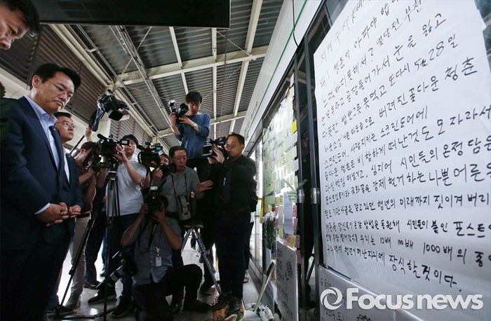 (서울=포커스뉴스) 정진석 새누리당 원내대표가 31일 오후 서울 광진구 지하철 구의역에서 스크린도어 정비 작업 중 사고로 숨진 김모(19) 씨의 사건장소를 방문해 고인을 추모하고 있다.