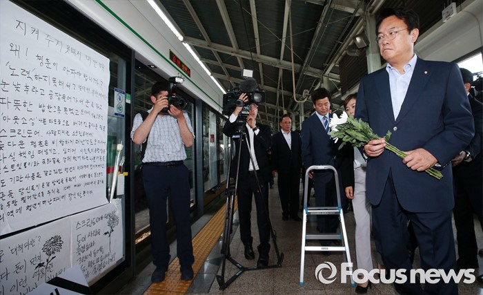 (서울=포커스뉴스) 정진석 새누리당 원내대표가 31일 오후 서울 광진구 지하철 구의역에서 스크린도어 정비 작업 중 사고로 숨진 김모(19) 씨의 사건장소를 방문해 고인을 추모하고 있다.