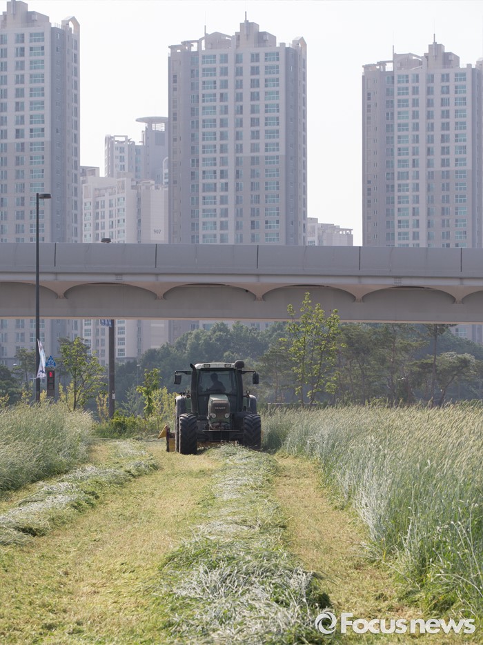 (세종=포커스뉴스) 31일 오후 세종시 정부세종청사 인근 한국토지주택공사 부지에 심은 호밀을 수확하고 있다.