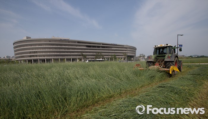 (세종=포커스뉴스) 31일 오후 세종시 정부세종청사 인근 한국토지주택공사 부지에 심은 호밀을 수확하고 있다.