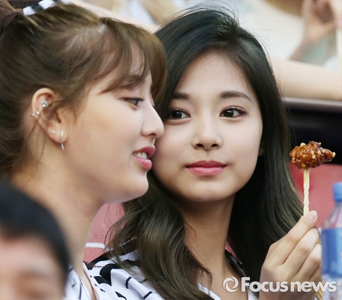 (서울=포커스뉴스) 31일 서울 잠실구장에서 열린 2016 프로야구 KIA-LG 경기에서 인기 걸그룹 트와이스의 지효(왼쪽)와 쯔위가 닭강정을 들고 고민하고 있다.