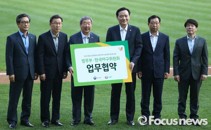 (서울=포커스뉴스) 31일 서울 잠실구장에서 열린 2016 프로야구 KIA-LG 경기에 앞서 한국야구위원회(KBO)와 법무부 사이에 클린베이스볼문화확산을 위한 업무협약을 가졌다. 김현웅 법무부장관(오른쪽에서 세번째)과 구본능KBO총재가 업무협약판을 들고 관계자와 함께 기념사진을 찍고 있다.
