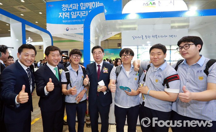 (서울=포커스뉴스) 이기권 고용노동부장관이 31일 오후 서울 COEX(3층 C홀)에서 개최된 청년과 함께하는 지역일자리 한마당에 참석해 학생들과 기념촬영을 하고 있다. <사진제공=고용노동부>