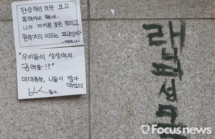 (서울=포커스뉴스) 1일 오전 서울 마포구 홍익대학교 정문에 설치된 극우성향 사이트 '일베' 상징물 조각상이 파손된 가운데 이를 비판하는 글이 담긴 종이가 정문에 붙어있다. 조각상은 일간베스트저장소를 상징하는 자음 'ㅇ'과 'ㅂ' 모양을 하며 회원을 인증하는 손 모양이다. '어디에나 있고, 아무데도 없다'는 제목의 이 조각상은 조소과 4학년 홍기하씨가 '환경조각연구' 수업 과제로 제작해 야외조각전에 출품한 것이다.