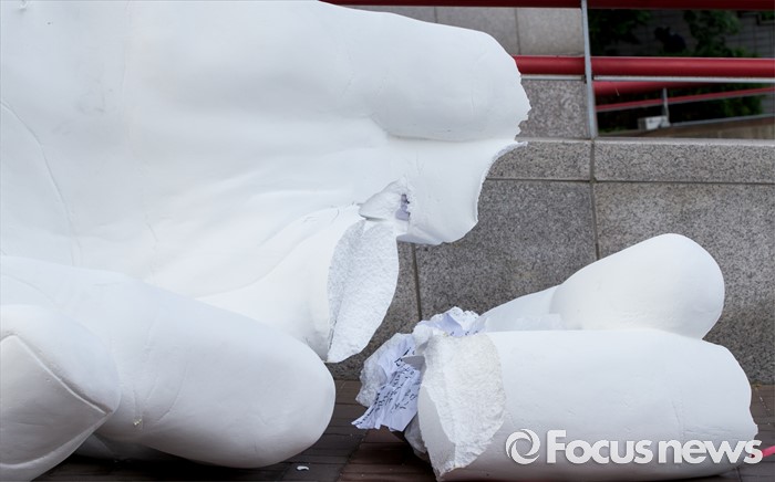 (서울=포커스뉴스) 1일 오전 서울 마포구 홍익대학교 정문에 설치된 극우성향 사이트 '일베' 상징물 조각상 파손된 채 길에 방치돼 있다. 조각상은 일간베스트저장소를 상징하는 자음 'ㅇ'과 'ㅂ' 모양을 하며 회원을 인증하는 손 모양이다. '어디에나 있고, 아무데도 없다'는 제목의 이 조각상은 조소과 4학년 홍기하씨가 '환경조각연구' 수업 과제로 제작해 야외조각전에 출품한 것이다.