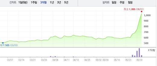 앞서 거래소는 5월31일 최근 현저한 주가급등 관련, 중요 공시사항 유무에 대해 조회공시를 요구했다. 답변시한은 이날 오후 6시까지다.주가흐름<사진출처=네이버 캡쳐>