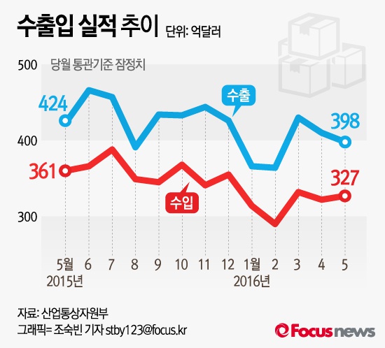 (서울=포커스뉴스) 산업통상자원부는 지난 5월 수출액이 지난해 같은 기간 대비 6.0% 줄어든 398억달러, 수입액 또한 9.3% 감소한 327억달러를 기록했다고 1일 밝혔다.