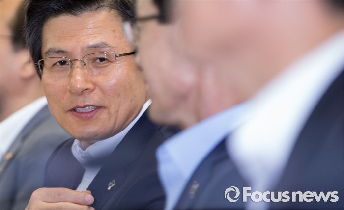 (서울=포커스뉴스) 1일 오전 서울 종로구 정부서울청사에서 열린 법질서관계장관회의에 참석한 황교안 국무총리가 상의에 착용한 나라사랑큰나무 배지를 가리키고 있다.