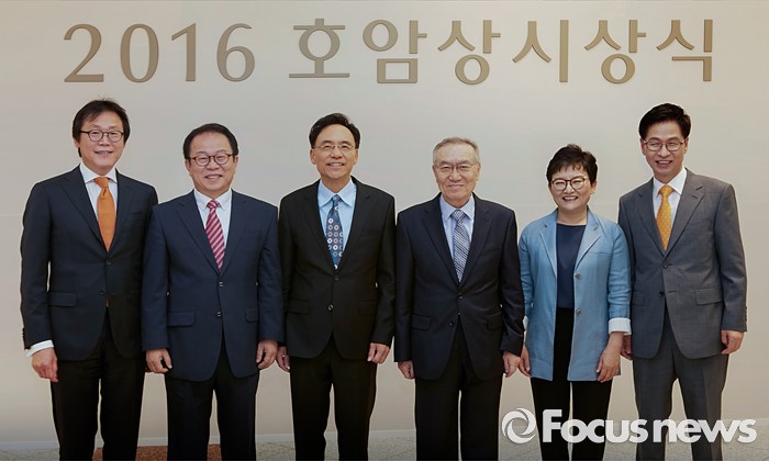 (서울=포커스뉴스) 1일 오전 서울 중구 호암아트홀에서 제26회 호암상 수상자들이 기념촬영을 갖고 있다. 왼쪽부터 과학상 김명식 박사, 공학상 오준호 박사, 의학상 래리 곽 박사, 예술상 황동규 시인, 사회봉사상 조순실, 김현수 공동대표. <사진제공=삼성>