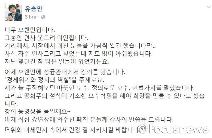 유승민 의원은 이에 대해 "성균관대에서 제가 늘 주장해오던 따뜻한 보수, 정의로운 보수, 헌법 가치를 말했다"며 "공화주의 철학에 기초한 보수혁명을 해야 희망을 만들 수 있다"고 설명하며 지난 강의에 대한 내용을 밝혔다.유승민 무소속 의원 페이스북 캡쳐 화면. 2016.06.01 최형욱 기자 wook@focus.co.kr