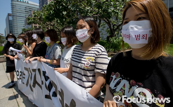 (서울=포커스뉴스) 1일 오전 서울 중구 프레스센터 앞에서 '언론의 여성혐오 조장 보도실태'에 반대하는 20대 여성들이 '우리는 기자회견女다' 기자회견을 갖고 있다.