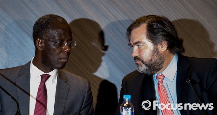 (서울=포커스뉴스) 1일 오후 서울 중구 플라자호텔에서 열린 '유엔인권이사회, 기업과인권 한국조사단 기자회견'에서 단테 페스케(오른쪽) 의장과 마이클 아도 의원이 한국 기업 인권 조사 결과 발표에 앞서 대화를 나누고 있다.