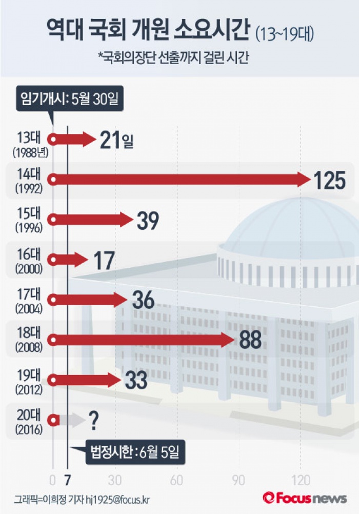 (서울=포커스뉴스) 여소야대 정국 속 여야의 힘겨루기가 거세지면서, 20대 국회의 개원이 늦춰지고 있는 상황이다. 지난 13대 국회부터 19대 국회까지, 국회는 28년간 무려 7회 연속 개원이 연기되는 파행을 빚어왔다.