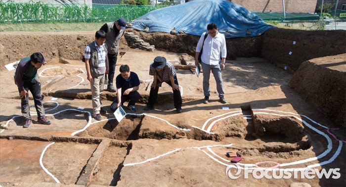 (충주=포커스뉴스) 충북 충주 칠금동 392-5번지 일대에서 백제 제철유적이 발견된 가운데 2일 현장에서 발굴조사 현장설명회가 열렸다. 학계관계자들이 제철유적을 살피고 있다.
