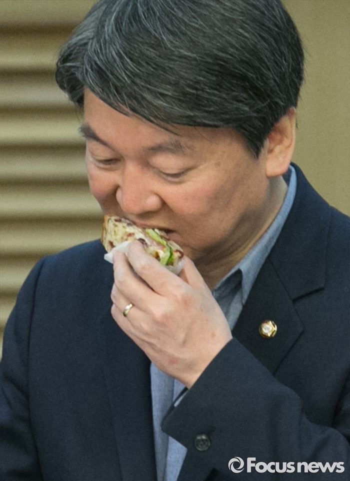 (서울=포커스뉴스) 2일 오전 서울 여의도 국회 의원회관에서 열린 국민의당 정책역량강화 집중 워크숍에 참석한 안철수 상임공동대표가 샌드위치를 먹고 있다.