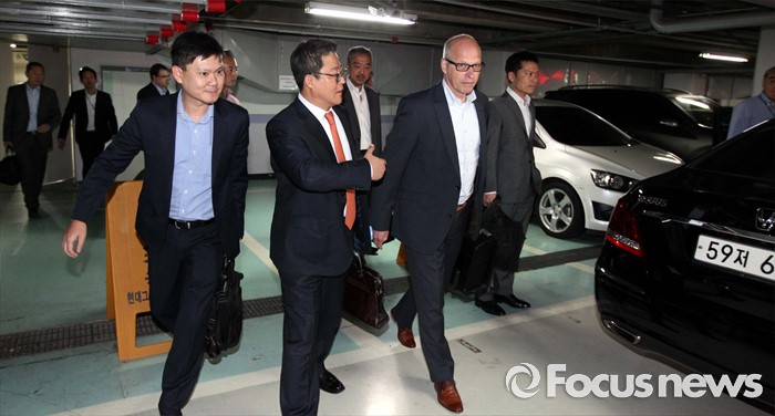 (서울=포커스뉴스) 2일 오후 서울 종로구 현대상선 본사에서 열린'G6' 해운동맹 회원사 협렵방안 회의에 참석한 제3 글로벌 해운동맹 디 얼라이언스 소속 해외 선사 관계자들이 회의를 마친 뒤 주차장으로 향하고 있다.