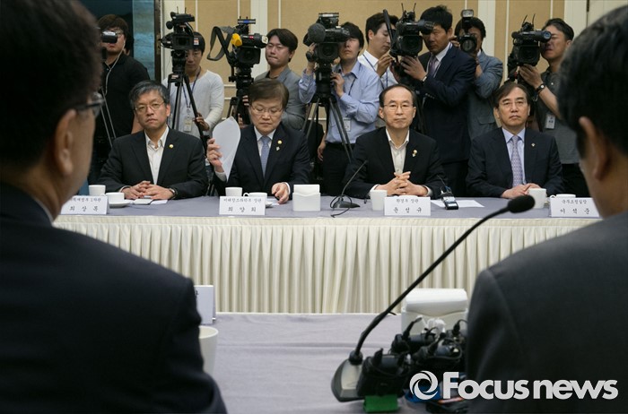 (서울=포커스뉴스) 2일 오전 서울 여의도 국회 귀빈식당에서 열린 미세먼지 대책 관련 당정협의에 참석한 장, 차관들이 정진석 새누리당 원내대표의 모두발언을 듣고 있다. 왼쪽부터 최상목 기획재정부 1차관, 최양희 미래창조과학부 장관, 윤성규 환경부 장관, 이석준 국무조정실장.