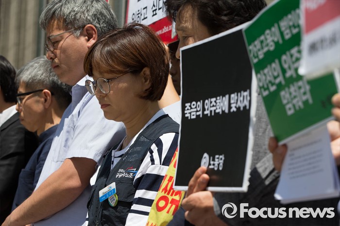 (서울=포커스뉴스) 2일 오전 서울 중구 서울시청 정문 앞에서 '서울시 지하철 하청노동자 사망재해 해결을 위한 시민대책위원회(가칭)'가 지하철 2호선 구의역 사고에 대한 책임자 처벌과 대책마련을 촉구하며 기자회견을 하고 있다.