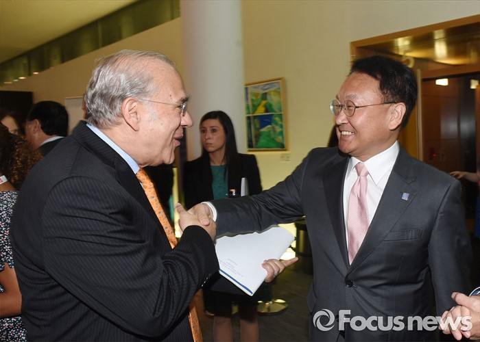 (서울=ㅍ커스뉴스) 2016년 OECD 각료이사회에 참석차. 프랑스 파리를 방문중인 유일호 부총리 겸 기획재정부 장관이 6월 1일 OECD에서 앙헬 구리아 OECD 사무총장과 면담에 앞서 악수하며 인사를 나누고 있다. <사진제공=기획재정부>