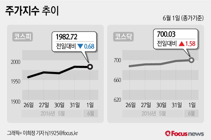 (서울=포커스뉴스) 1일 코스피지수는 전날 보다 0.03%(0.68포인트) 내린 1982.72에 장을 마쳤다. 코스닥지수는 전일 대비 0.23%(1.58포인트) 오른 700.03에 마감했다.