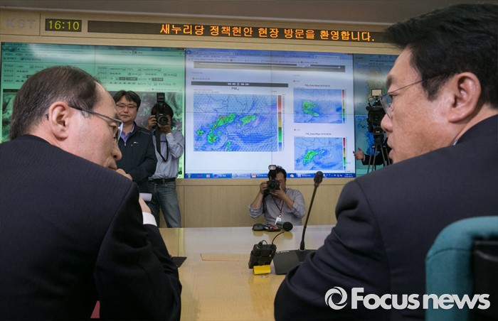 (서울=포커스뉴스) 미세먼지 대책과 관련해 현장 방문에 나선 정진석(오른쪽) 새누리당 원내대표가 1일 오후 서울 동작구 기상청 종합상황실을 방문해 윤성규 환경부 장관과 대화하고 있다.