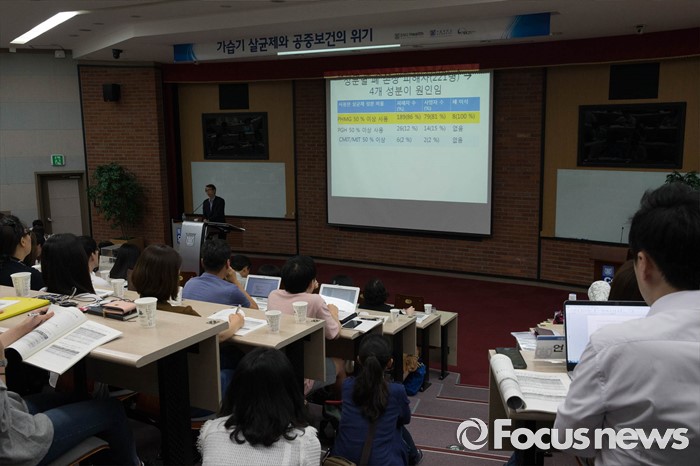 (서울=포커스뉴스) 2일 오후 서울 관악구 서울대학교 관악캠퍼스 교수학습 개발센터에서 열린 '가습기 살균제와 공중보건 위기' 집담회에 참석자들이 발표내용을 보고 있다.